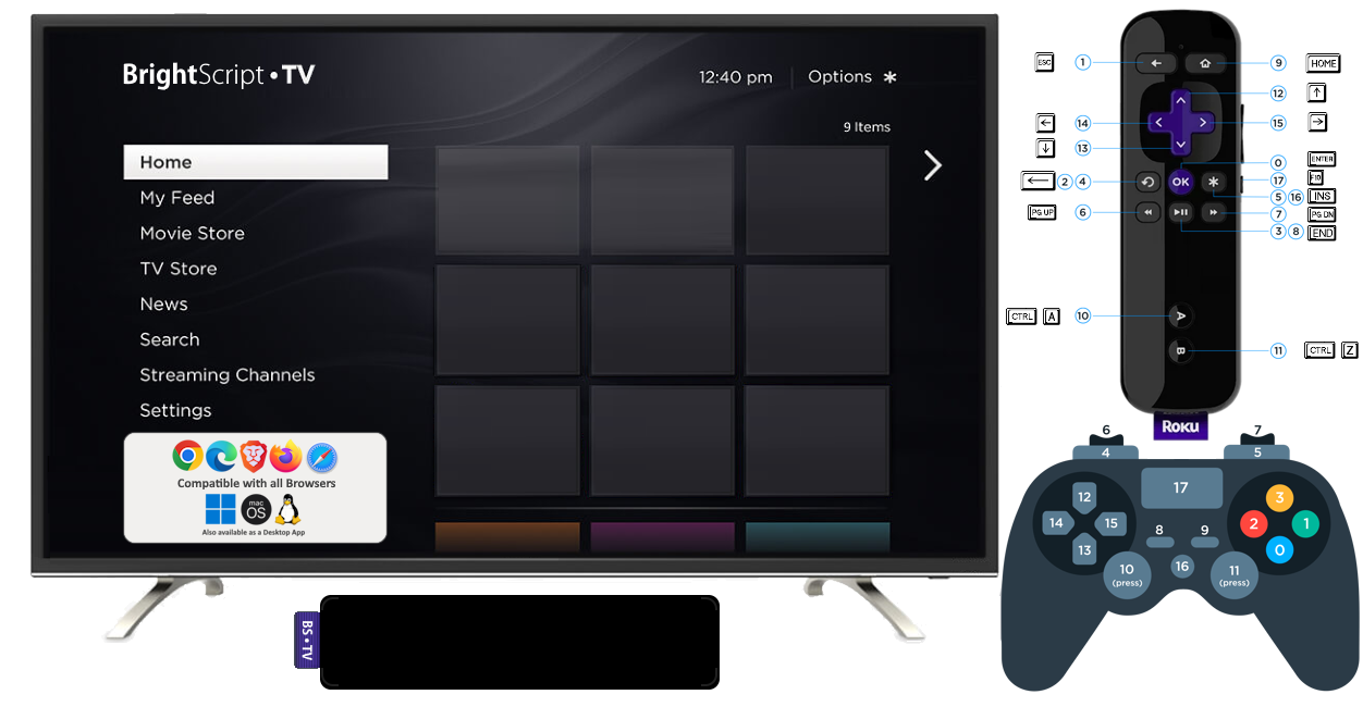 – Use your keyboard to navigate on the games and apps, the image you see on the right side, shows what keys that are mapped to the Roku remote control buttons.